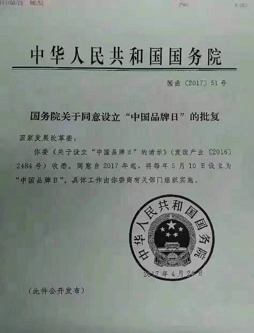 “中国产品向中国品牌转变”,因此,2017年4月24日国务院发文批复将每年5月10日设立为“中国品牌日”。