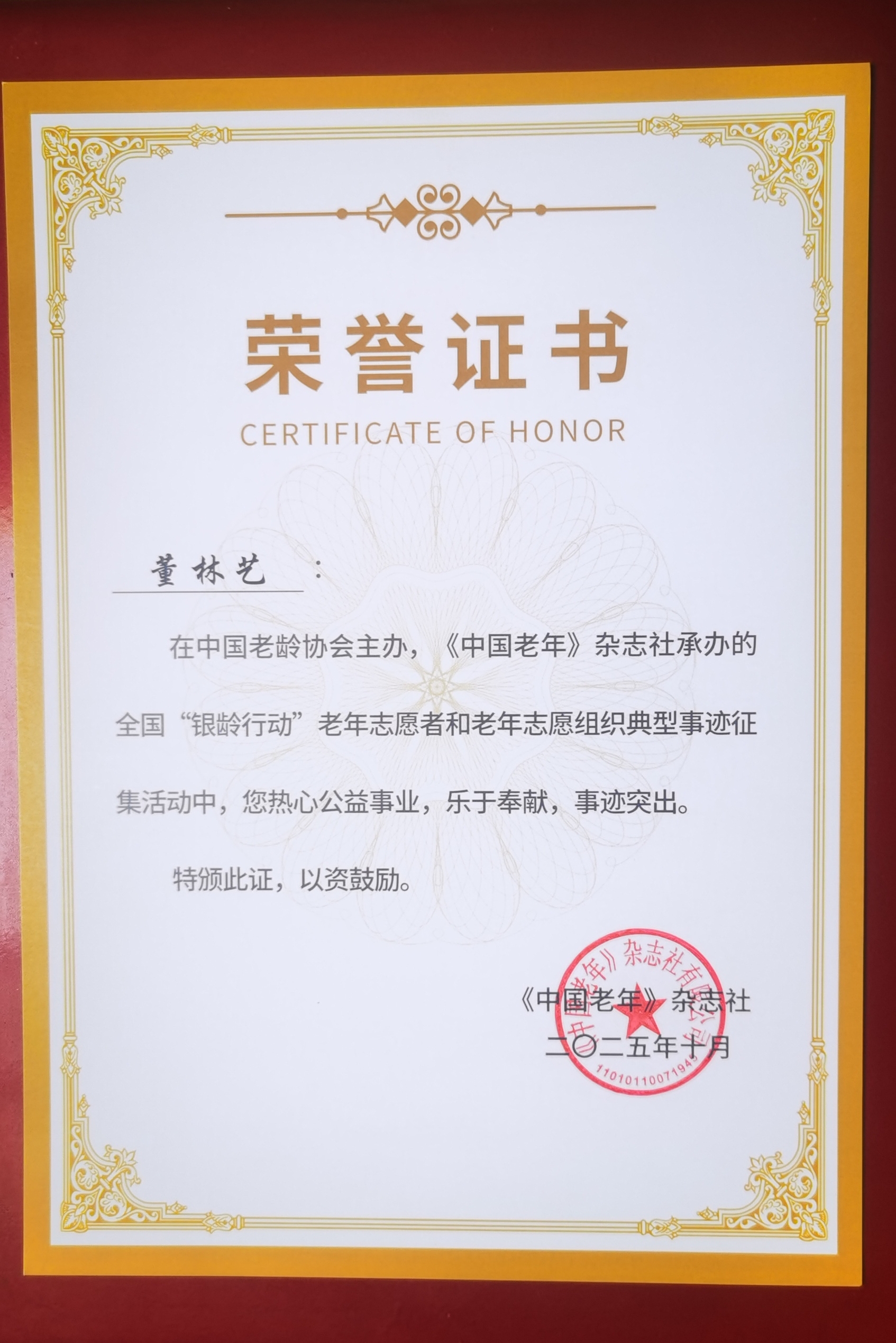 证书题词如下:“董林艺同志:在中国老龄协会主办、《中国老年》杂志社承办的全国‘银龄行动’老年志愿者和老年志愿组织典型事迹征集活动中,您热心公益事业,乐于奉献,事迹突出。特颁此证,以资鼓励。”落款单位为《中国老年》杂志社,日期为二五年十月。